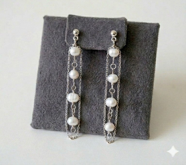 Each earring features natural freshwater pearls placed along delicate stainless steel chains. The layered structure creates a flowing silhouette that moves softly with every step, adding dimension without overwhelming the design.