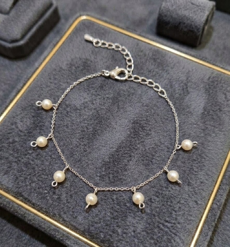 Natural freshwater pearls are spaced along a delicate stainless steel chain, allowing each one to move freely and reflect its natural luster. The small drops create a gentle rhythm across the wrist, giving the bracelet a soft and elegant feel.