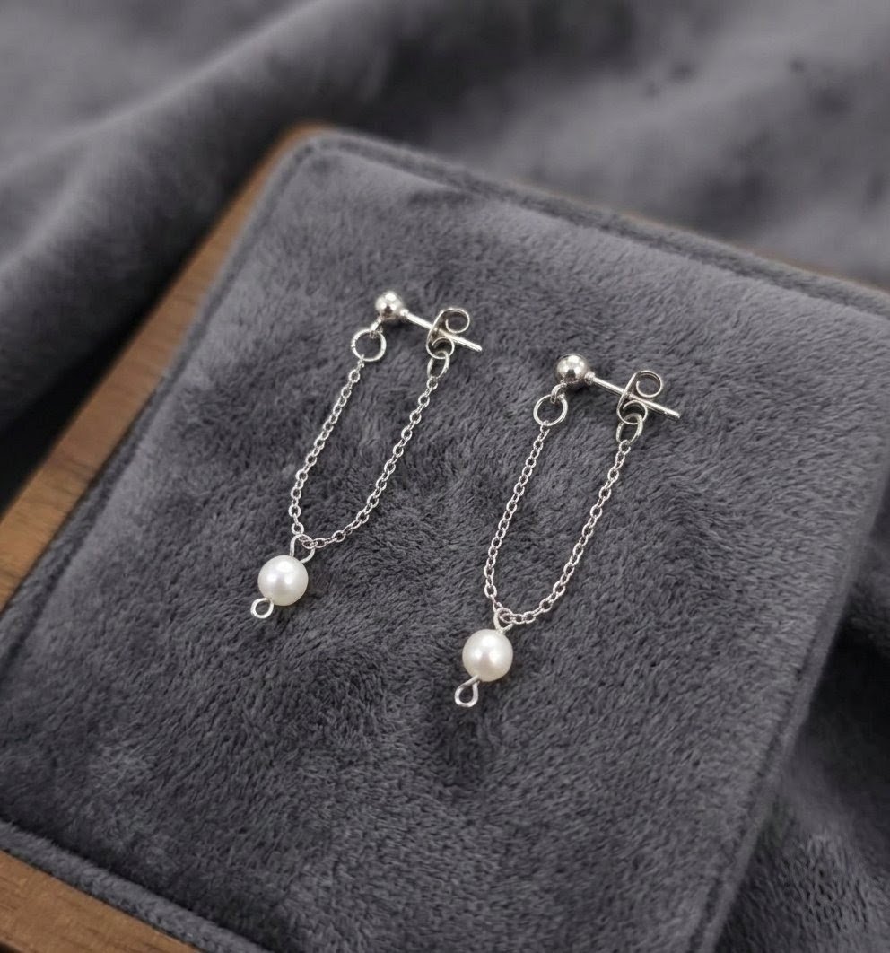 Each earring features a natural freshwater pearl charm suspended from a delicate stainless steel chain. The gentle movement of the pearl adds softness and elegance while keeping the overall design minimal and modern.